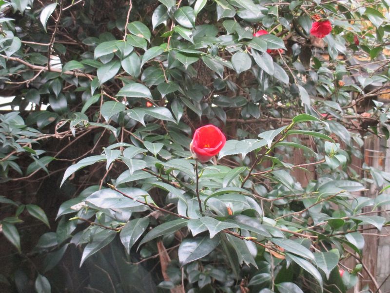 中庭に、この寒さの中、鮮やかな赤い花が咲いた。