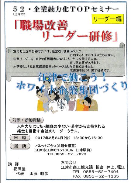 今日は、当HPのトップでも告知していた江津 企業魅力化TOPセミナーの内の「 職場改善リーダー研修」