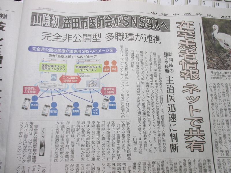 今日の朝刊に、災害時用ではないが、在宅患者情報をSNSを使って共有化する事を益田市が山陰初の導入との記事が出ていた。