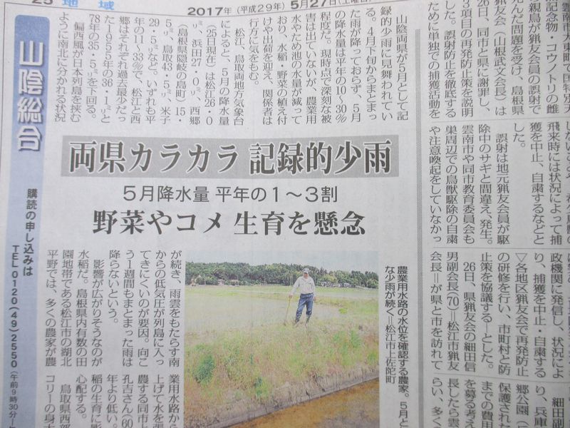 今日の新聞によると、5月の降水量は、平年の1~3割との事で、野菜や米の育成に懸念があると