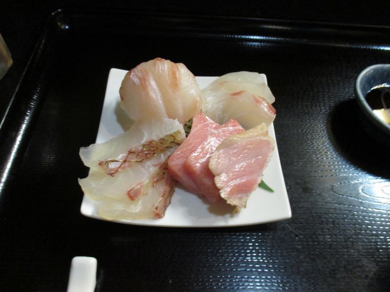 洒落家は無いが、手前左が鯛の湯引きした皮つき、手前右が大トロ。