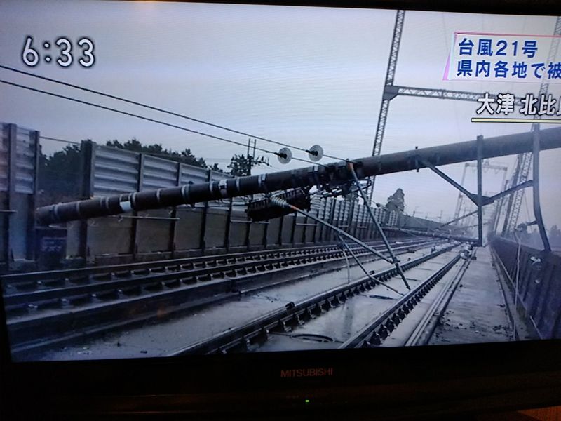 今、ニュースで、湖西線は、電柱が20本折れて、レールの上に倒れたりしているとの事。