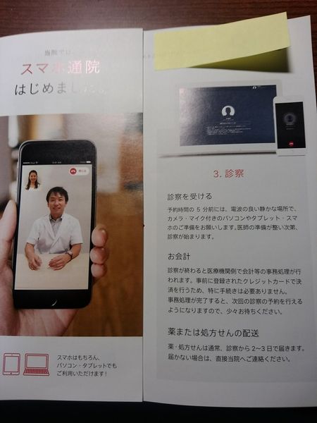 パンフレットには「スマホ通院」とあり、受付からスマホで行い、状況によっては診察もWebカメラ等で実施、薬も配達するというもの。