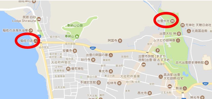左の赤丸の浜が、稲佐の浜で、神様が上陸されるところです。