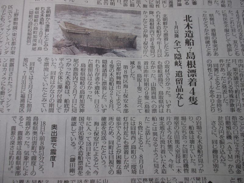 今日の朝刊によると、今年、島根県に4隻の漂着が有った。と。