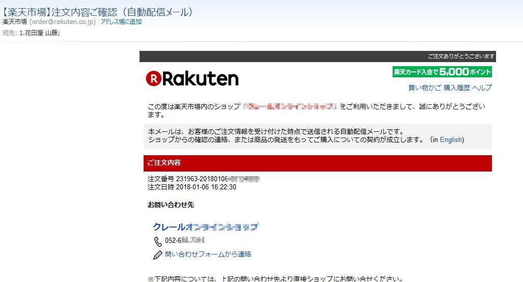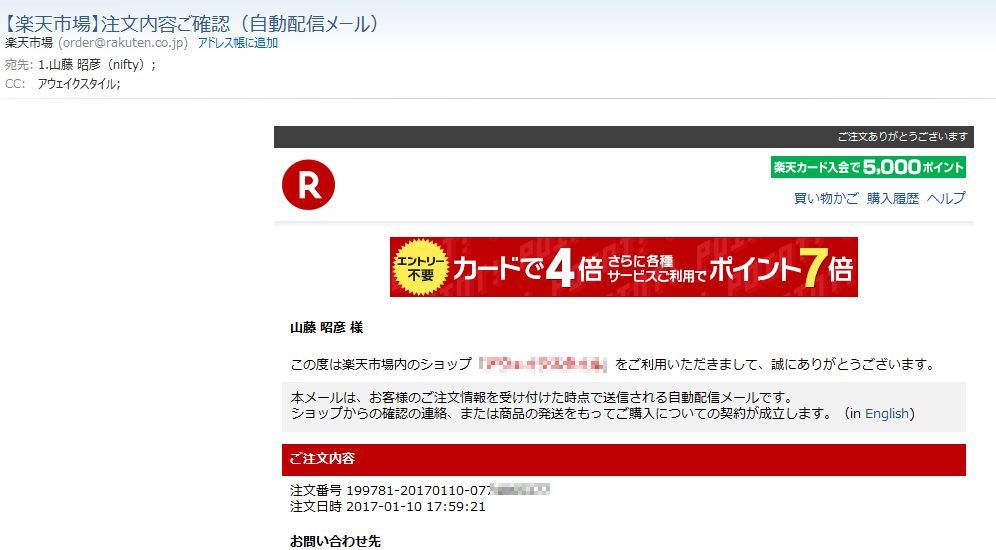昨日、楽天から「注文内容ご確認(自動配信メール)」が来た。