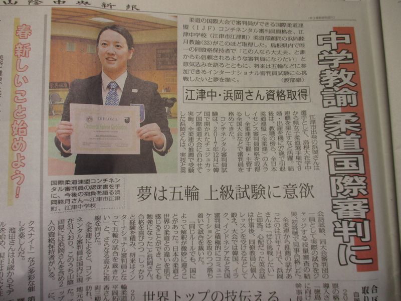 江津中の濱岡睦月先生が、島根県初の柔道国際審判員(コンチネンタル)の資格を取得した。と。