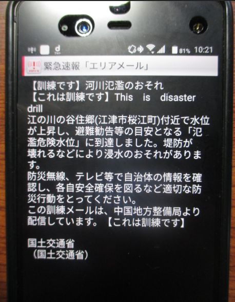 江津市の防災メールもありますが、登録者は限定されている事や、他地域からたまたま来ている方もおられる事を考慮すると、エリアメールは、有効だと思います。