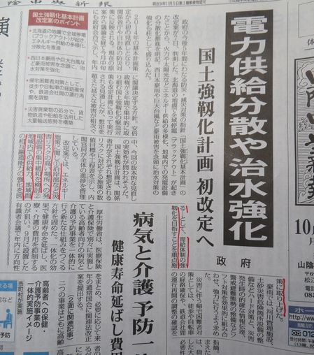 今日の地元紙の1面トップ記事は、「国土強靭化計画 初改定へ」との記事