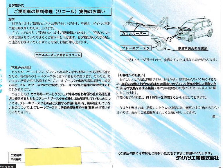 「カウルルーバーにおいて、ダッシュパネルとの合わせ部の止水処理が不適切な為、雨水等がブレーキブースターに滴下するものがあります。その為、そのままの状態で使用を続けると、ブレーキブースターの錆が早期に進行し、最悪のの場合、ブレーキブースターに穴が開き、ブレーキペタルの操作力が増大するおそれがあります。」と。