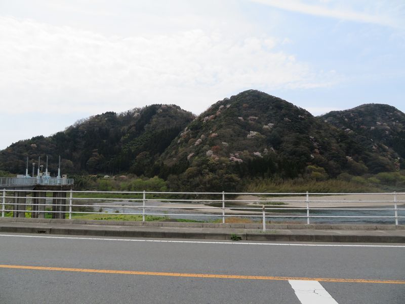山の中に、ピンク色がとこどころにあり、山桜が咲いていると思われます。