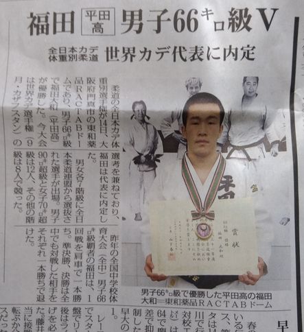 島根県立平田高校1年の福田選手が、全日本カデ体重別選手権66キロ級で優勝と。