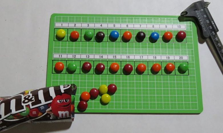 少々、出来の悪いm&mチョコレート(日本のマーブルチョコレートと比較すると、その精度は明らか)を使用し、20ヶのチョコの製品の合否を個人単位で判定し、それぞれ2回実施し、個人の反復性、複数人の再現性(測定者間のばらつき)を測定。