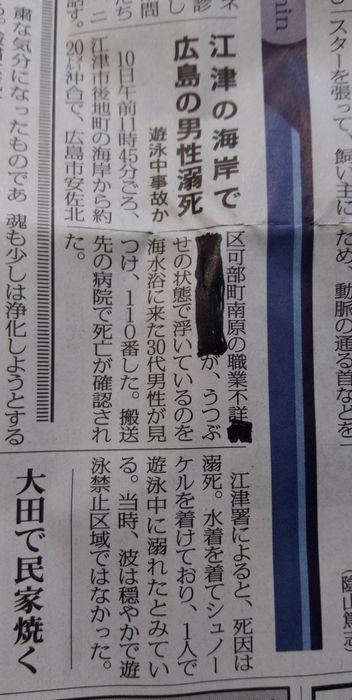 ここの所、水難事故が報道されているが、今朝の朝刊に、江津市での水難事故の記事が・・・。