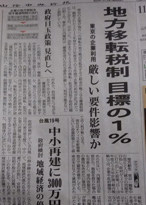 今日の朝刊トップに、「地方移転税制 目標の1%」と。