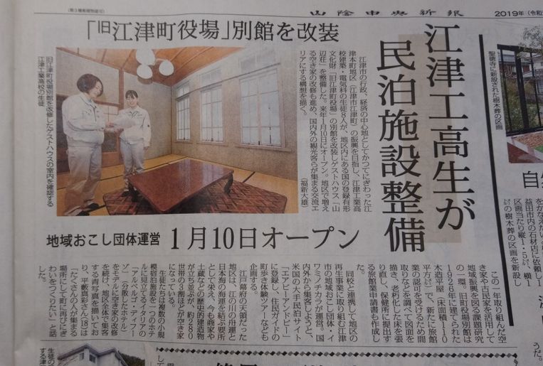 江津工業高校のが、ここの町内にある登録有形文化財「旧江津町役場」の別館を改装しゲストハウス「山辺荘」整備した。と。