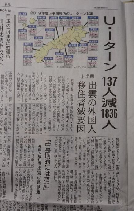 今朝の新聞によると島根県の2019年度上期のU・Iターン者が、前年同期比で137名減の1836名だった。と。
