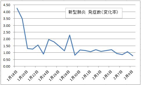 変化率を見ても、1/30頃から、1.0程度で推移しており、2/5あたりからは、1.0を下回る日も出てきている。