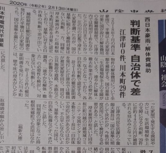 一昨年の西日本豪雨で、県西部を流れる江の川流域では河川が氾濫し、大きな被害がでたことから、国や県などで作る協議会は、水害が発生したときの具体的な行動を明記した「水害タイムライン」を策定した。と。