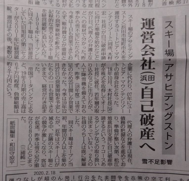 しかし、今年、初めてとの事で、スキー場が倒産したとの記事。