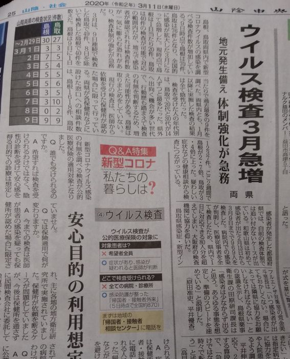 今朝の新聞に、島根県内のウィルス検査数が掲載されました。