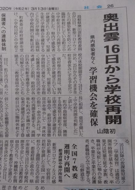 ただし、記事によると、町内や島根県東部、隣接する鳥取県日南町や広島県庄原市で感染者が出た場合、政府の一斉休校指示・命令が出た場合は、再び休校にする。と。