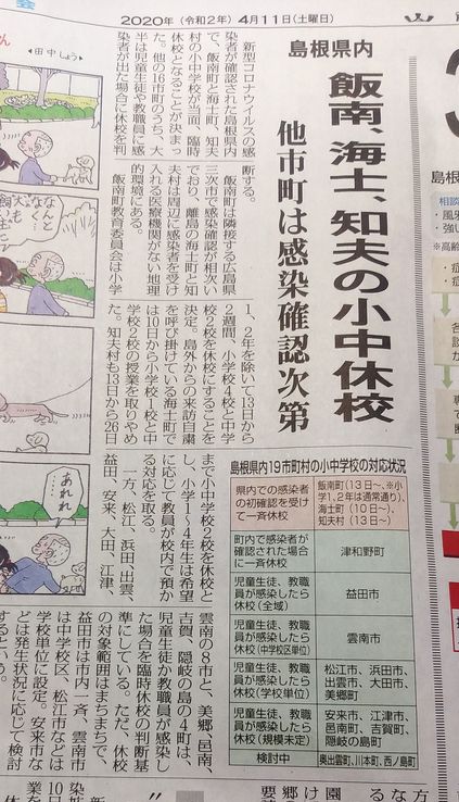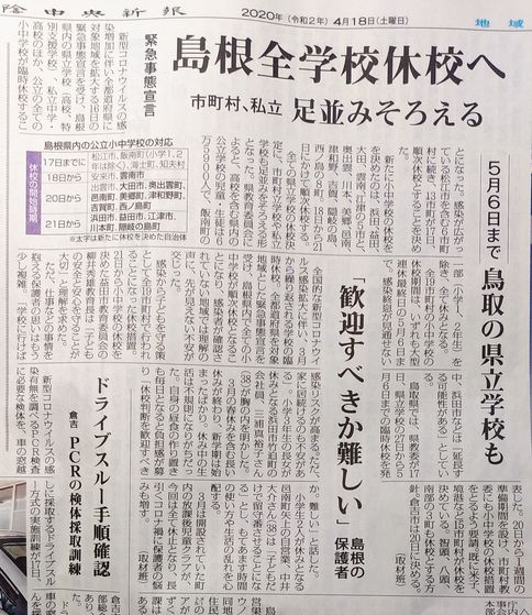 全国の緊急事態宣言を受けて、島根県内の小中も休校が、始まります。