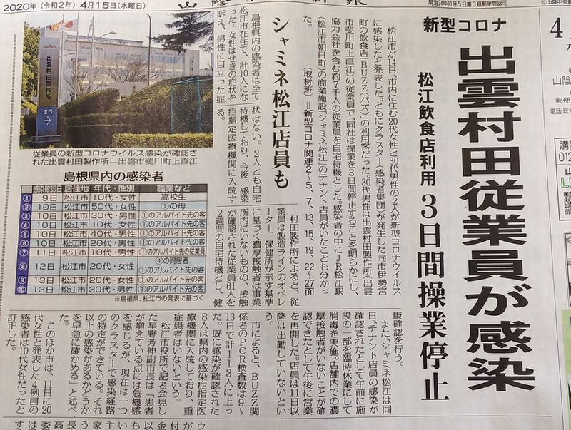 島根県では、4/9に初感染者が出たのですが、クラスターが発生していた様です。