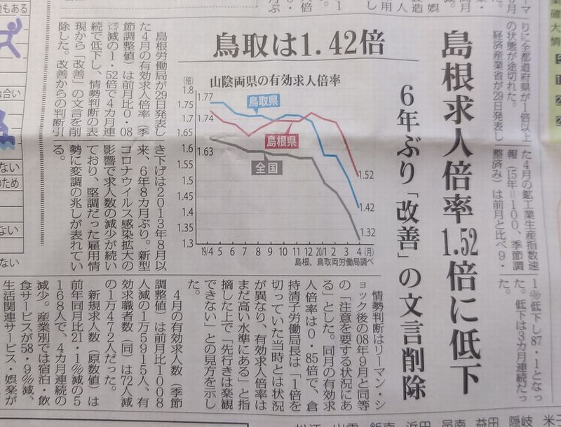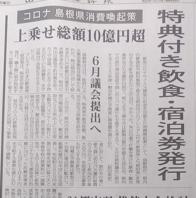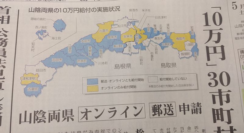 今日の朝刊に、山陰両県の特別定額給付金10万円の配布状況が出ていました。