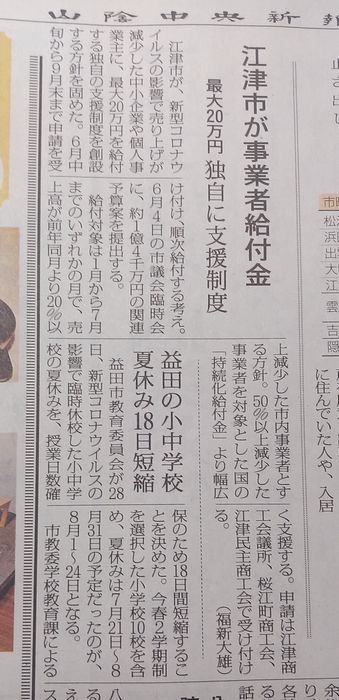 江津市からも、20万円の給付金が、用意される事は、大変ありがたい事だと思います。