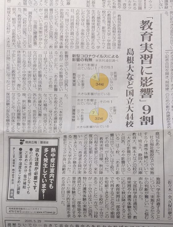 今日の朝刊の1面に、大学での教育実習等の日程に影響が出ている。と。