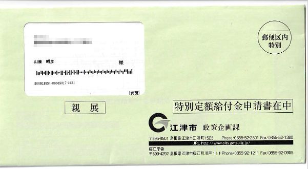 今日、市役所から「特別定額給付金申請書」が届きました。