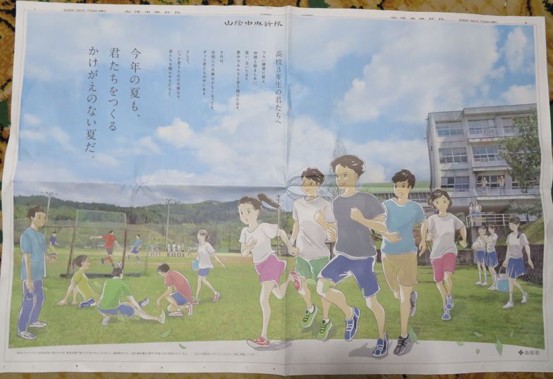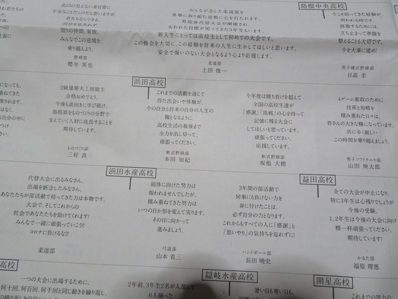 新型コロナウイルスの感染拡大に伴う5月の休校中、矢上高校(島根県邑南町矢上)の生徒99人が考えた感染予防の標語とデザインから選ばれた最優秀賞1点がTシャツになった。と。
