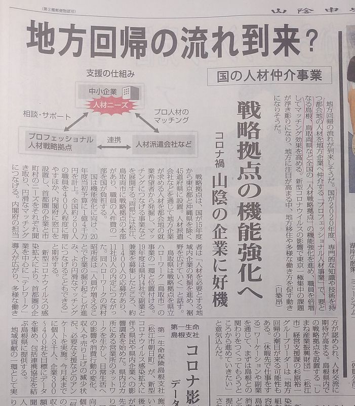 国が2020年度、専門的な知識や技術を持つ都会地の人材を地方企業へ仲介する「プロフェショナル人材事業」で、島根県では、要となる「人材戦略拠点」の機能強化を進め、職員を倍増してマッチング効果を高める。と。