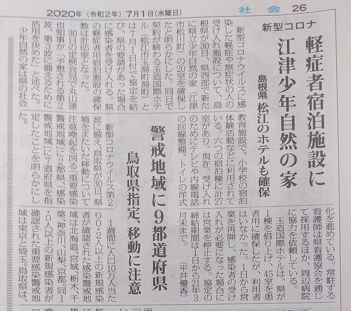 島根県としては、松江市の店でクラスターが発生し、その関係者、お客及びその家族の24名が発症しましたが、5/2以降は、感染者は出ていない事で、何となく安心感が広がってはいますが、徐々に他県への出張が始まり、他県からの観光客も増えています。