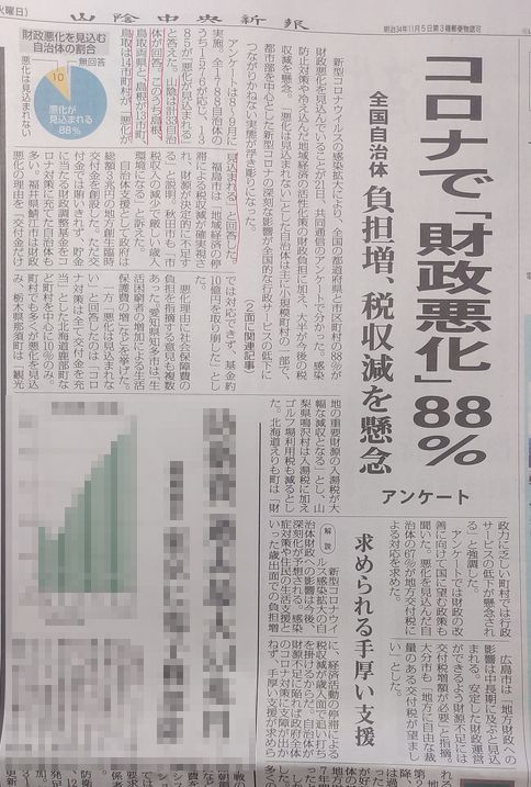 新型コロナウイルスの感染拡大により、全国の都道府県と市区町村の88%が財政悪化を見込んでいる。と。
