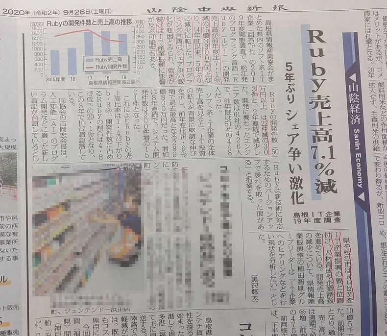 島根県の2019年度のRuby開発関連の売上高が減少した。との記事。