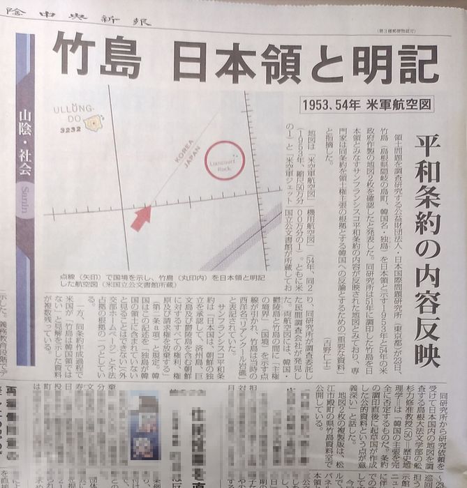 領土問題の調査研究などを行う公益財団法人「日本国際問題研究所」(東京)は、韓国が不法占拠する竹島が日本領であると明確に記した1953(昭和28)、54(同29)年の米国政府作製の航空図2枚が、米国国立公文書館で見つかったと発表した。と。