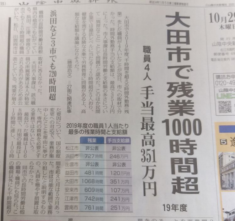 お隣の大田市で、年間残業時間が1000時間超がいた。と。
