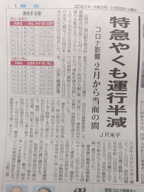 もう一つ、コロナの影響で、岡山から山陰地方の特急が2月から半減される様です。