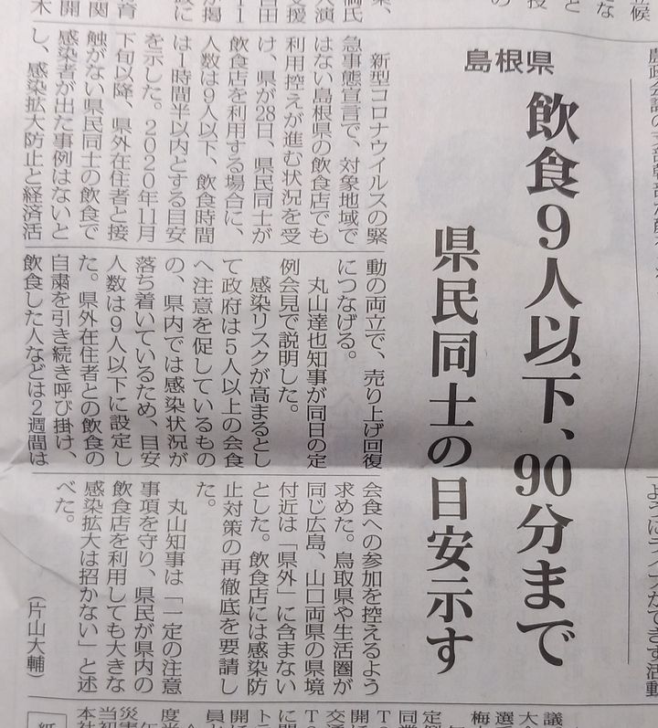 島根県が、コロナの緊急事態宣言の対象地域でもないのに、飲食店の利用控えが進む中で、県民同士の飲食店の利用目安を示した。と。