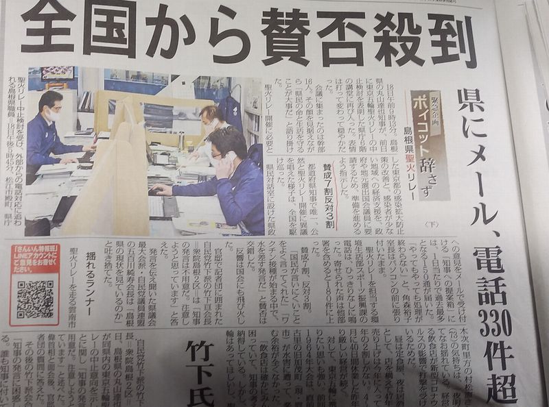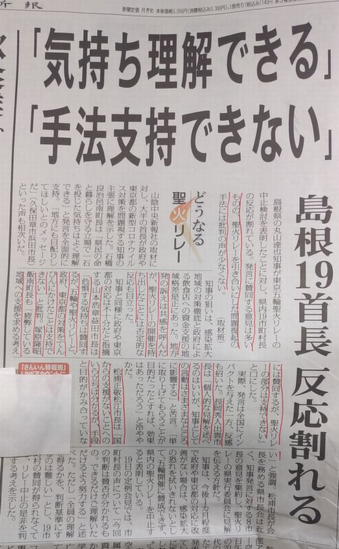 先日、島根県知事の「聖火リレーの中止の検討を始める。」との発言に対して、県内の19市町村の首長に対して、地元新聞社が意見を聞いたようです。