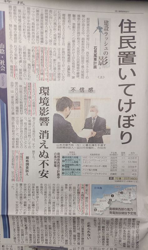 記事によると、大田市から益田市まで73基23万9800kwとの事。