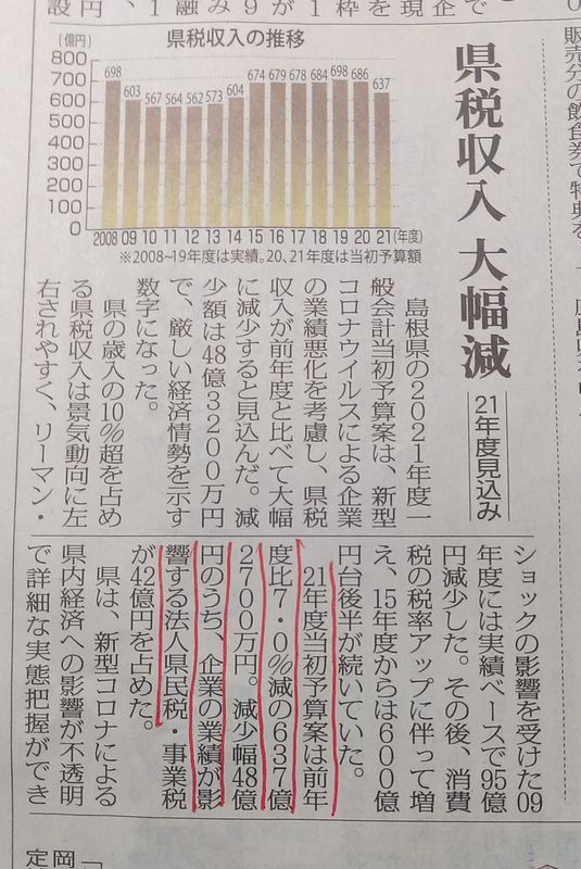 2021年度の県税収入が、前年度の7%程度減となる見込みの様です。