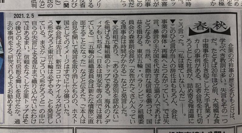記事では、冒頭雪印の20年前の社長の「私は寝てないんだ」と発言した件を引用し、最後には、「どういう形でも五輪はやる」と発言した中に、自らの失言による混乱まで織り込んでいた訳ではあるまい。と少々イヤミを込めて書いてあります。