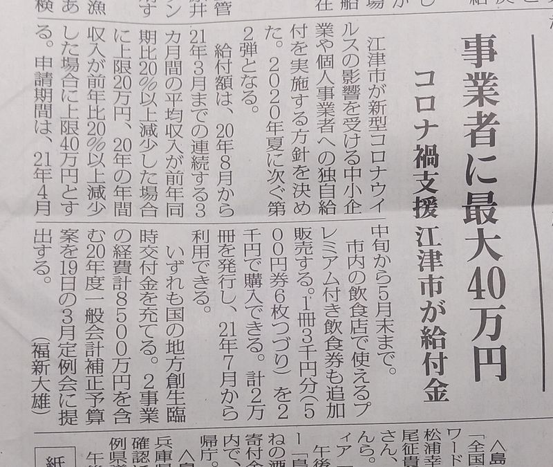 3か月間の昨年同月比で、収入が減少している事業者等へ最大40万円の給付金です。