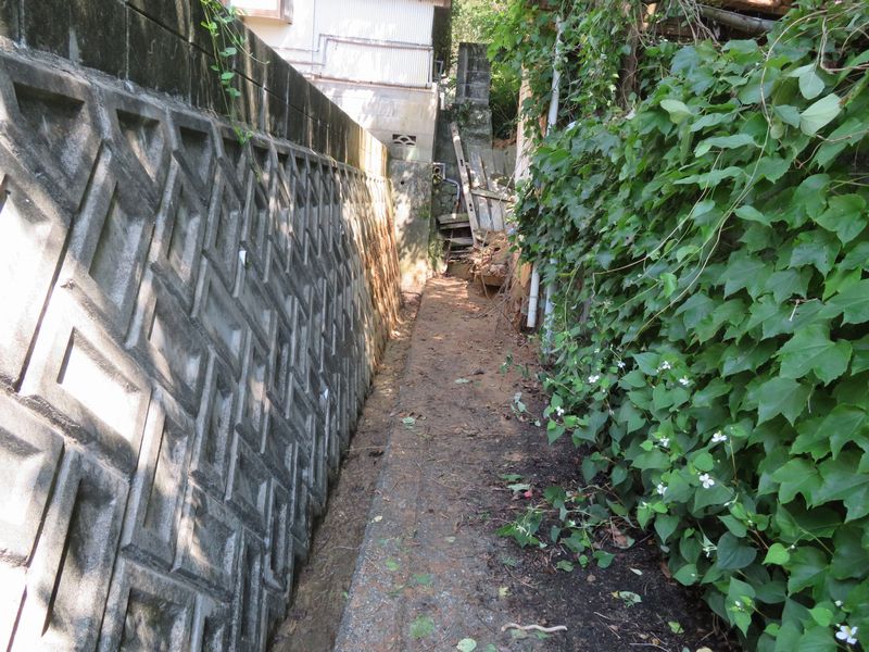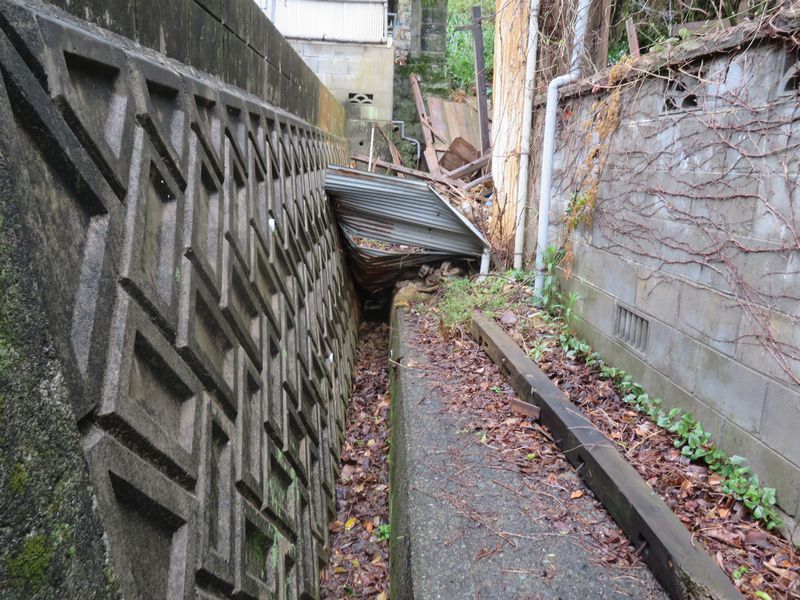 以前、市に見に来てもらった様ですが、市の対象外と・・。勿論、崩落した家の処置は出来ませんが、溝は、山からの雨水を流す重要な溝です。市の範囲では無いかと思うのですが・・?(2001年3月に撮影。)