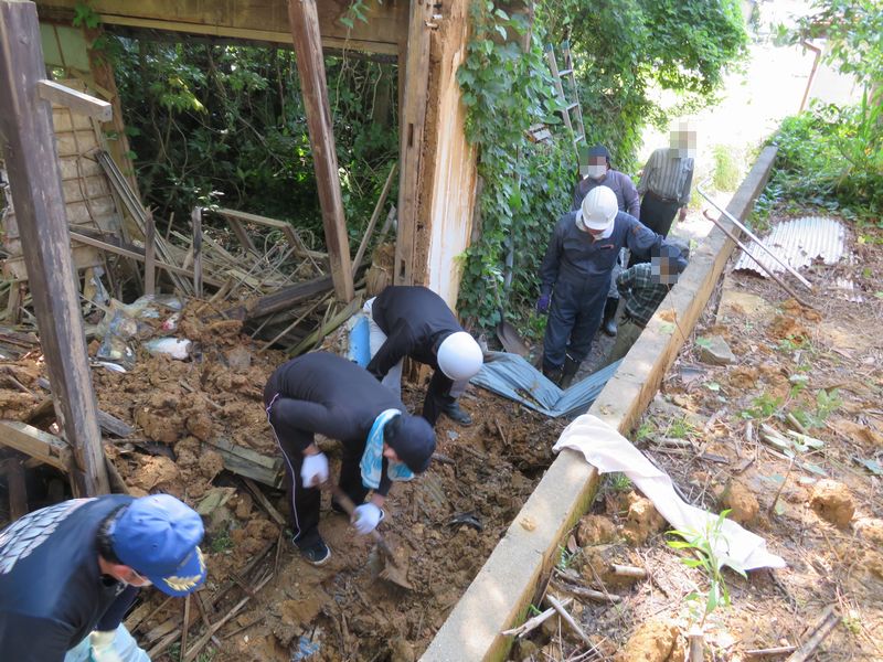 そんな天気の中で、町内の空き家(持ち主不明)の壁が崩落し、溝に覆いかぶさっていたところがあり、以前、私か自治会長の時に”お助け隊”の結成した旨報告しましたが、そのお助け隊の方々に参集頂き、撤去作業を行いました。