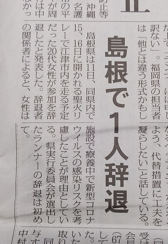 島根県で、初の聖火ランナー(一般人)の辞退が出た様です。