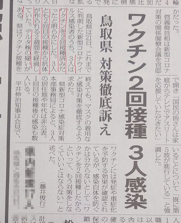 鳥取県での感染者で、ワクチンを2回接種し2週間以上経過している方が、3人感染した。と。